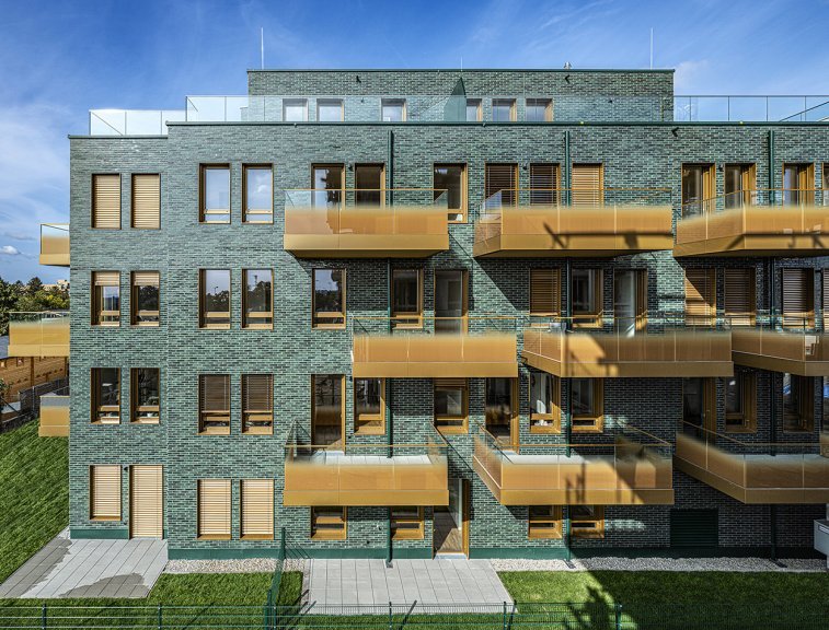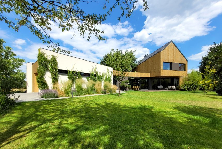 Namo „Plochata“ fasadas pagamintas su ETICS Baumit Open, galutinėmis dangomis NanoporTop ir PuraTop K2.0. Spalvos yra NanoporColor atspalvių 0019 ir 0881.