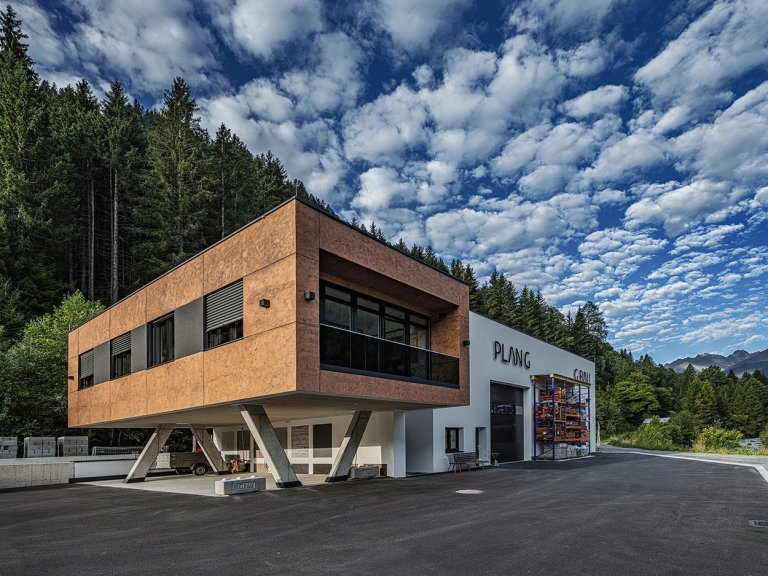 Viskas iš vienų rankų – nuo planavimo iki statybos. Šį neįprastą įmonės pastatą kūrybinio pastato savininkas ne tik suplanavo, bet ir pastatė savo rankomis kartu su darbuotojais. Rezultatas yra įspūdingas ir sujungia funkcionalumą su individualiu dizainu. Biurų pastatas, pastatytas ant stulpų, buvo suprojektuotas naudojant „Baumit CreativTop“ rūdžių išvaizdą. Jis labai aiškiai išsiskiria iš paprastų, bet funkcionalių pardavimo ir sandėliavimo zonų.