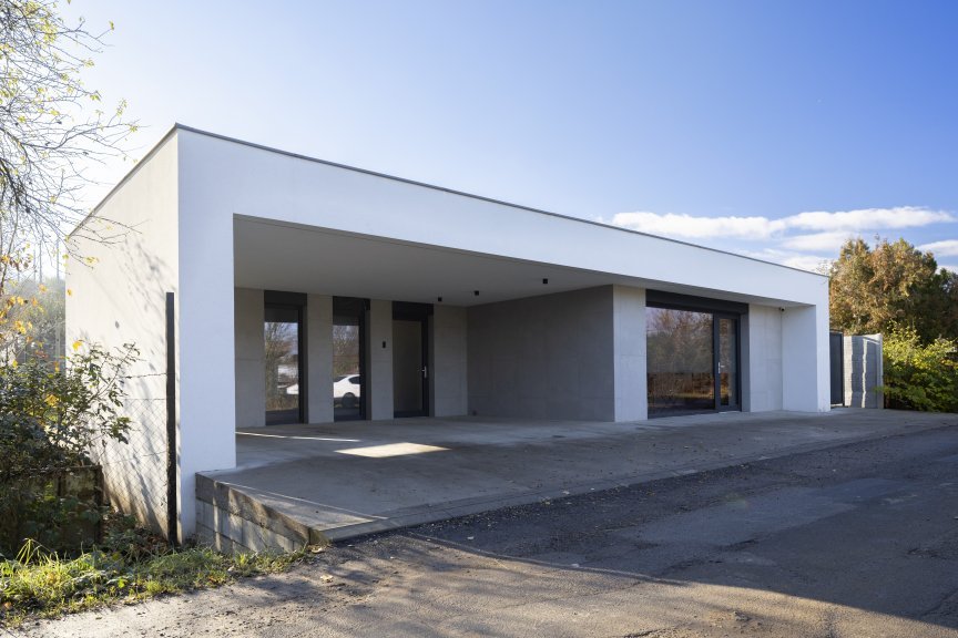 Kompaktiškas monochromatinis namo apvalkalas sujungia operacinių blokų trejetą ir paslepia įvairią vidinę struktūrą. Svarbi koncepcijos dalis yra ryšys tarp gyvenimo ir lauko per plačias įstiklintas zonas ir dengtą terasą. Medžiaginis sprendimas išryškina tiesias architektūros linijas, ritmą ir gradaciją.